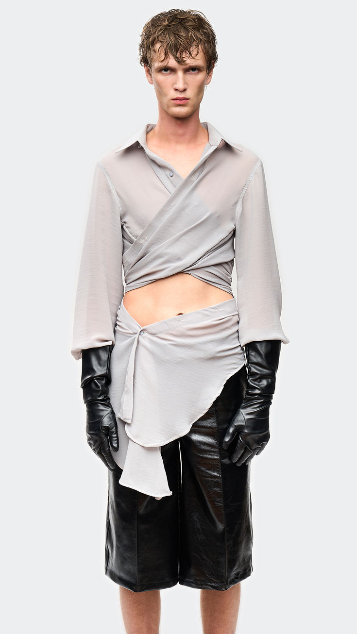 Camisa confeccionada em musseline com recorte nas costas e comprimento super alongado na parte frontal. A modelagem permite o uso transpassado, oferecendo múltiplas possibilidades de styling.